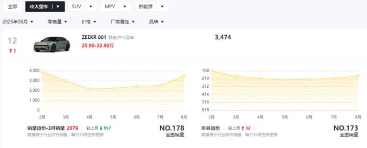 作为参考,在售的2025款极氪001单电机后驱版最大功率310kW,配备95kWh或100kWh电池,CLTC续航里程分别为722km、755km。双电机四驱版采用前270kW、后310kW的电机组合,配备95kWh或100kWh电池,CLTC续航里程分别为675km、705km。