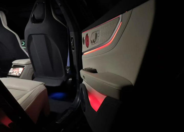 此外,新车门板采用全新布局,应用漫反射氛围灯,这是当下比较流行的见光不见灯设计。同时,新车弃用了旧款的雅马哈音响,新的音响罩支持氛围灯点亮。后排门板上的座椅调节按键更加丰富,后排右座设有脚托,预计将增加更多舒适功能。扶手后方的后排控制屏尺寸增大,或将提供更多娱乐功能。更引人注目的是,实拍车型还配备了星光顶,推测为选装配置。